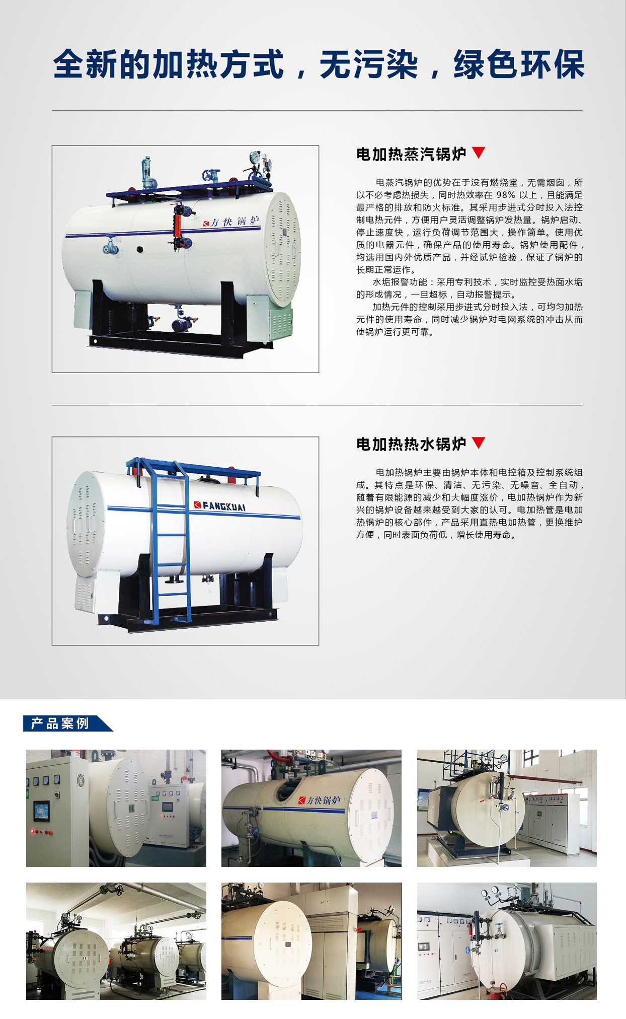 方快电热水锅炉系列采用最新电热技术及控制系统,由锅炉本体、电控箱及控制系统组成,通过自动控制装置,确保运行过程中液体控制器或高、中、低点击探棒反馈控制水泵的开启、闭合、供水量长短以及炉胆加工时间;按恒温、节能的优化运行原则,随着水温的变化,控制系统不断进行温度采集、逻辑运算和数字芯片控制调节,从而达到系统自动恒温,实现采暖和提供生活热水的目的。具有使用方便、操作简单、经济实惠、应用领域广泛的优点。