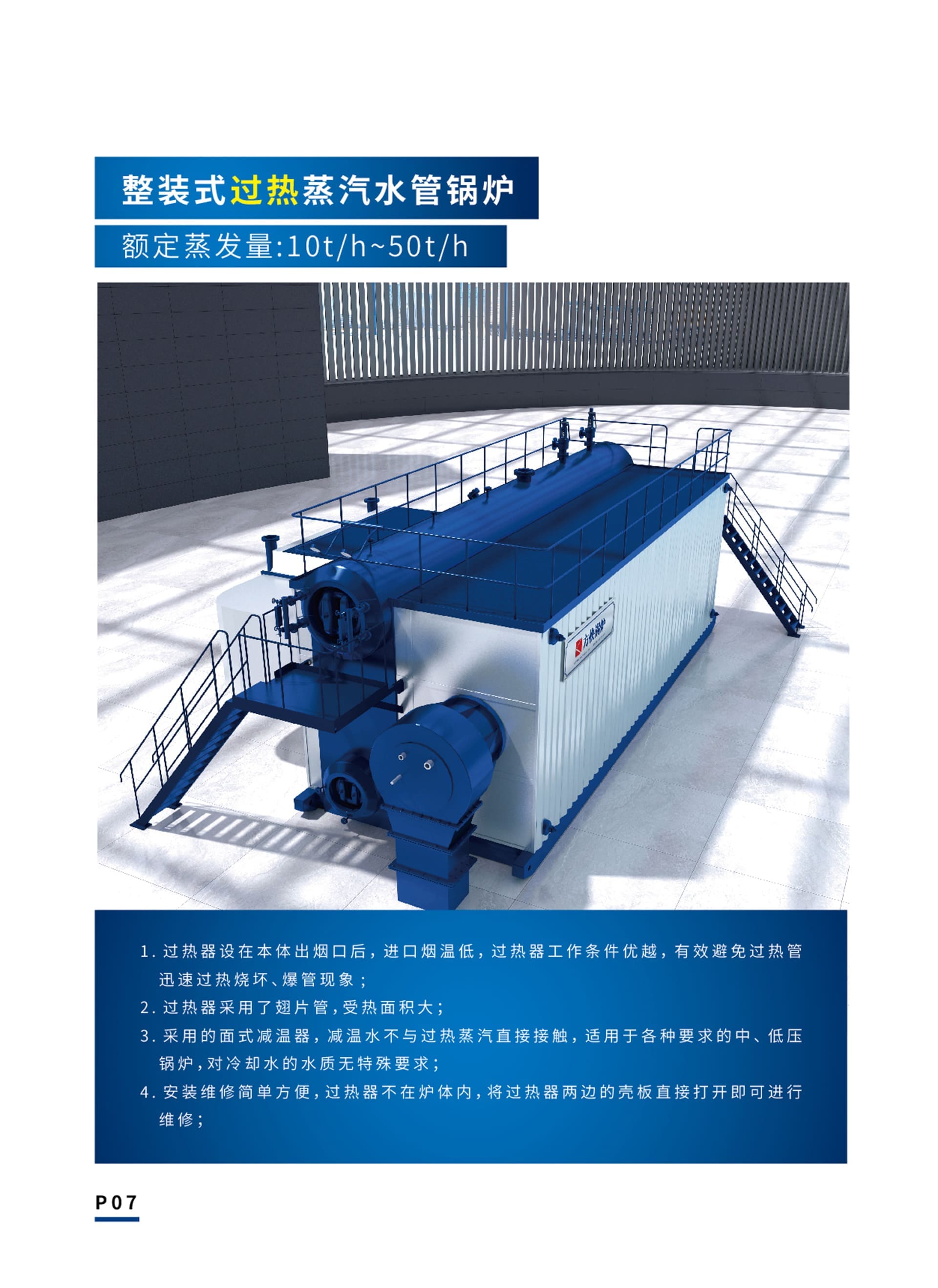 方快整装式过热蒸汽水管锅炉。过热器设在本体出烟口后,进口烟温低,过热器工作条件优越,有效避免过热管迅速过热烧坏、爆管现象;过热器采用了翅片管,受热面积大;采用的面式减温器,减温水不与过热蒸汽直接接触,适用于各种要求的中、低压锅炉,对冷却水的水质无特殊要求;安装维修简单方便,过热器不在炉体内,将过热器两边的壳板直接打开即可进行维修