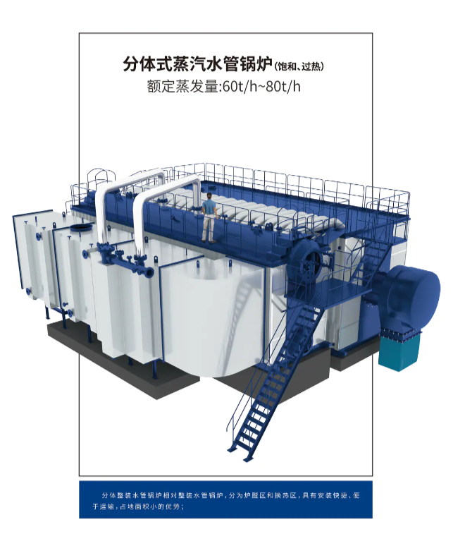 方快分体式过热蒸汽水管锅炉,拥有良好可靠的水循环系统,从上锅筒前端经对流管束进入下锅筒,再由下锅筒经对流管束进入上锅筒, 如此往复,沿设置的流程从前向后逆烟气流向作上升、下降流动,最后由上锅筒后端的出水管座引出,进入热网系统。保温材料选用硅酸铝毡和超细玻璃丝绵,总厚度高,两种保温层间使用空气夹层,锅炉散热损失降至最低,热效率大大提高,节省燃料,运行费用低。